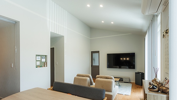 リビングは白壁でシンプルさと天井高が生む開放感。このコントラストにより、家の中に“メリハリ”が生まれており、
