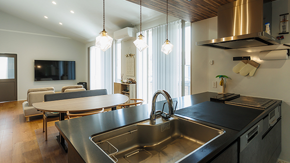キッチンとリビングではガラリと雰囲気が変わるのも面白いポイント。同じ空間にいながら違う雰囲気を味わえます。