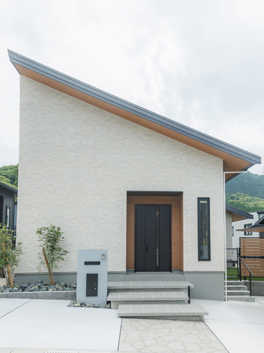 白単色のナチュラルな佇まいと、印象的な屋根の傾き。
