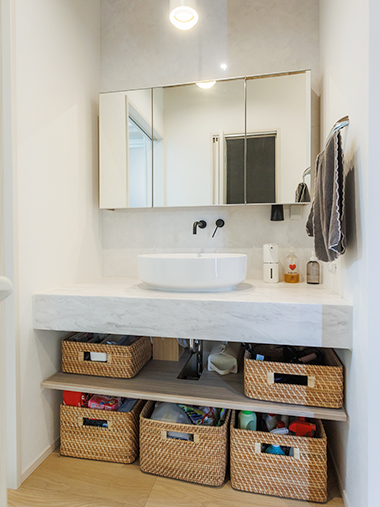 洗面台やキッチン、リビングへと続く空間には、自然光がやわらかく差し込み、家族それぞれの動きや視線が心地よく交わります。